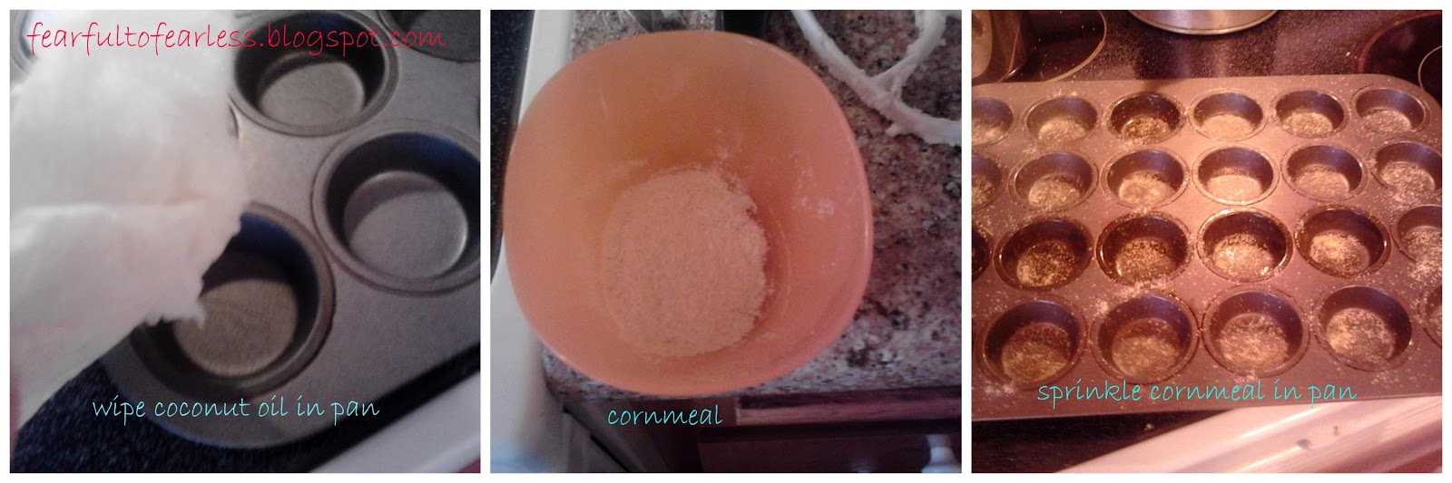- Grease a mini muffin pan and sprinkle a little cornmeal in each spot.